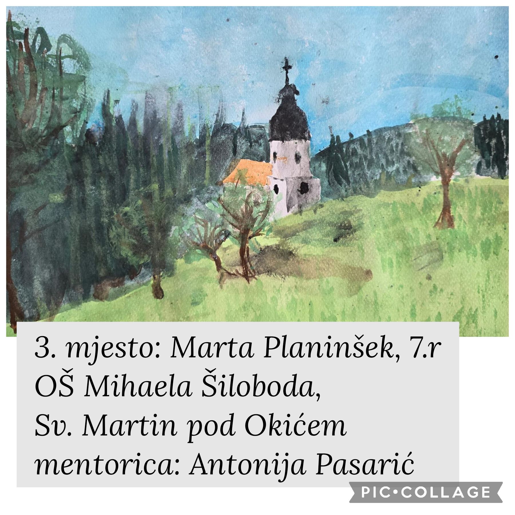Katolička osnovna škola u Šibeniku bila je organizator ovogodišnjeg međunarodnog likovnog natječaja „Crkve našeg grada“. Na natječaj je pristiglo čak 757 likovnih radova, a naša učenica 7. razreda Marta Planinšek osvojila je 3. mjesto u kategoriji viših razreda osnovne škole. Na nagrađenom radu učenica je prikazala Crkvu sv. Martina tehnikom vodene boje.