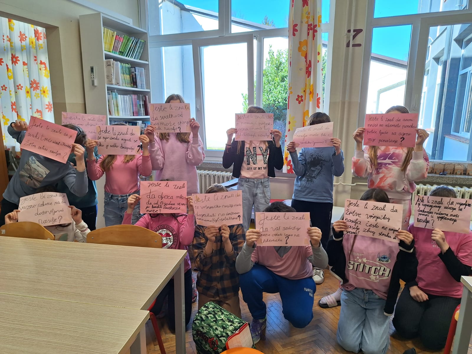 Učenici 4. a razreda obukli su ružičaste majice te pisali „Jeste li znali…“ poruke vezane uz vršnjačko nasilje koje su postavili po hodnicima škole.